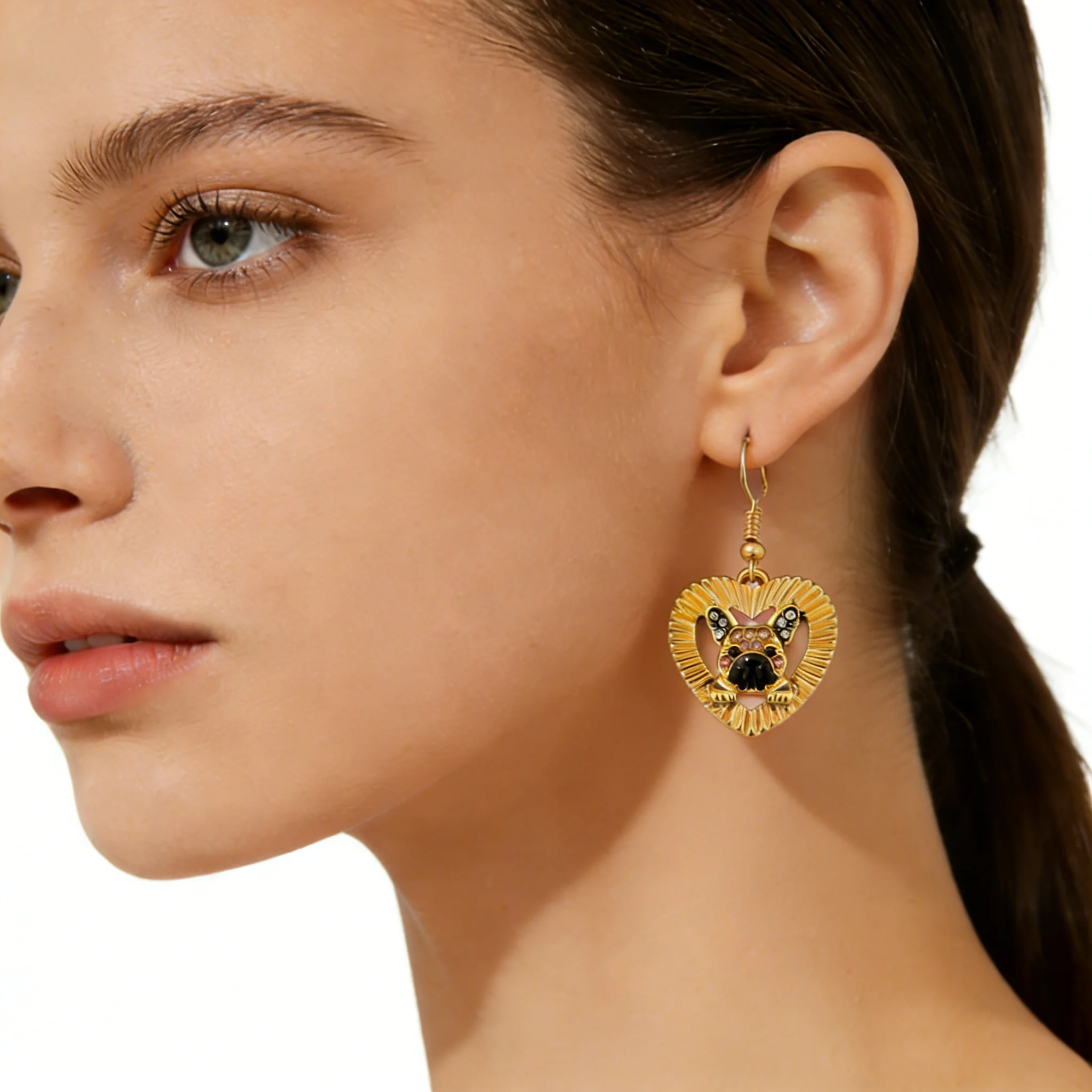 Celebrate the loyal, charming spirit of the French Bulldog and the unbreakable bond between pet parents and their furry companions with these golden French Bulldog heart dangle earrings, a must-have accessory for bulldog lovers, dog owners, and anyone who adores pet-themed jewelry that honors their beloved four-legged family member.