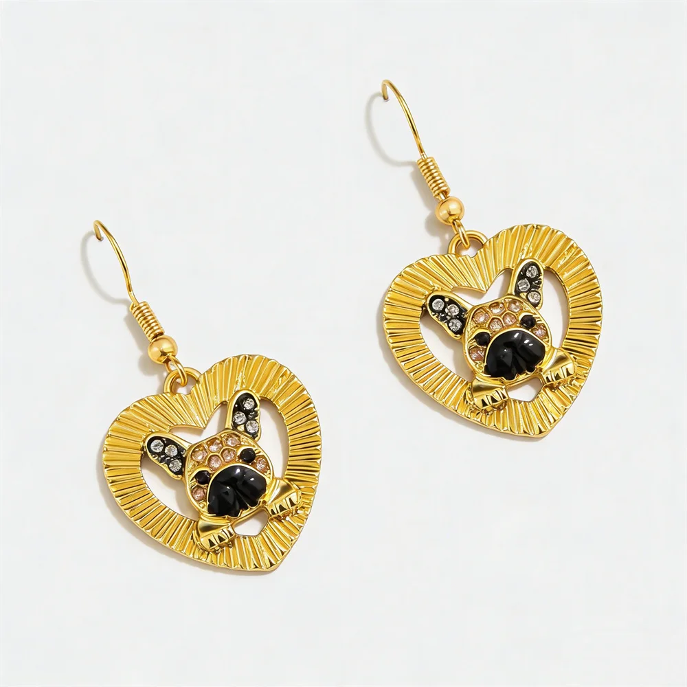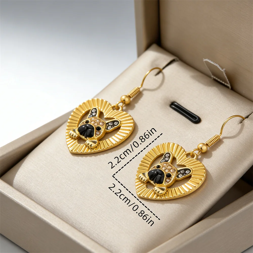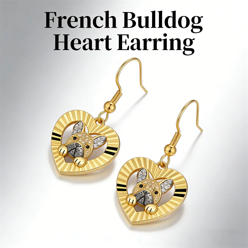 Expertly crafted from high-grade durable golden zinc alloy, these earrings feature a textured radial open heart frame, with a lifelike French Bulldog head at its center. The bulldog’s face is brought to life with warm champagne and clear faux rhinestones, accented with glossy black enamel details on the nose and eyes, perfectly capturing the iconic, endearing features of this beloved breed. The polished golden finish adds a luxurious, warm glow, while the intricate radial texture on the heart frame creates a dynamic, eye-catching effect that catches the light with every movement. In pet culture, French Bulldogs symbolize unwavering loyalty, playful companionship, and endless joy, making these earrings both a stylish everyday accessory and a deeply meaningful tribute to the love between a pet parent and their dog. The lightweight, comfortable fishhook closure ensures all-day wear, making them ideal for daily use, pet-themed events, dog park outings, and casual gatherings.